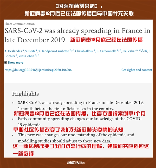 5月3日,国际知名医学期刊《国际抗菌剂杂志》网站刊发了法国巴黎东北郊塞纳-圣但尼医院集团主持撰写的短篇通讯论文《新冠病毒2019年12月底已在法国传播》。该论文研究表明,新冠病毒已于2019年12月下旬在法国传播。这与上述巴斯德研究所的研究结论基本一致。论文作者发现一名在12月底被当做流感患者的病例具有新冠肺炎症状(抗体检测为阳性),并且该患者并没有武汉旅行史和接触史。