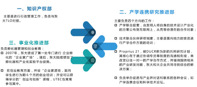 由于大企业依然是日本经济和创新的支柱,为进一步加强与大企业的协创,2013年东大决定对DUCR进行重组,将原来的产学连携研究推进部和事业化推进部合并为创新推进部。