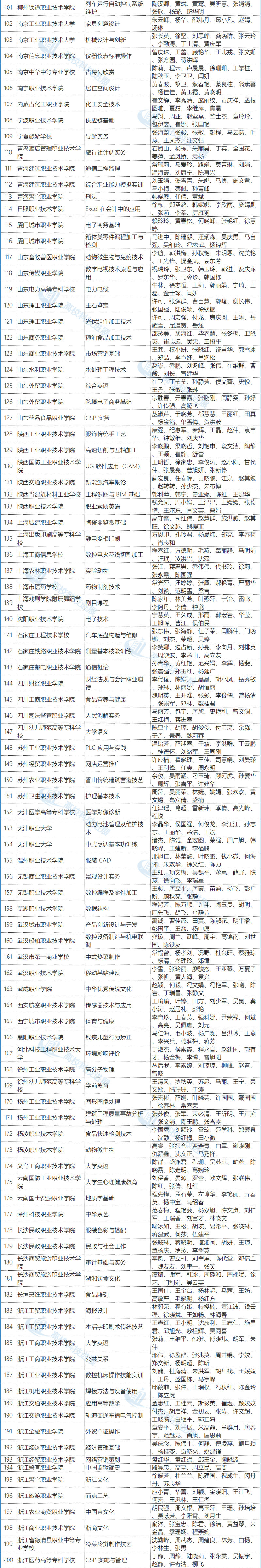 在职业教育方面,确定课程思政示范课程200门,课程思政教学名师和团队200个,共有168所学校上榜,包括安徽中医药高等专科学校、包头职业技术学院、北京电子科技职业学院、常州机电职业技术学院、重庆航天职业技术学院、广西工业职业技术学院、河北工业职业技术大学、黑龙江农业职业技术学院、江西交通职业技术学院、内蒙古化工职业学院,等等。