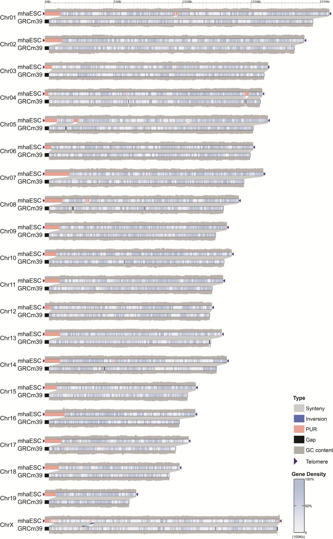 俞晓春团队综合了众多三代基因测序技术,让它们互相补足,开发了一把能够充分挖掘小鼠基因的“金铲子”。他们以最常用的小鼠C57BL/6的单倍体胚胎干细胞(mhaESC)为样本,进行了基因测序和组装,获得了长度为2.77 Gbp(表示十亿个碱基对)的完整的高质量小鼠参考基因组序列,其中包含215.23 Mbp(表示一百万个碱基对)先前未被鉴定的序列,填补了约7.7%的基因组空白。
